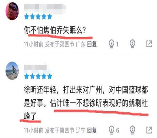 考虑到上一场广东队的比赛,杜锋在赛后回应陈家政为何上场机会不多的那番言论,广东球迷看到徐昕在广州打得如此出色,也开始调侃起来:“如果你在广东就会在发布会听到,徐昕打得不错,但是换下谁?”