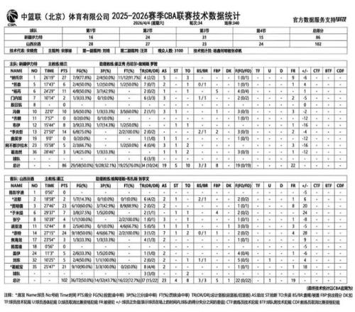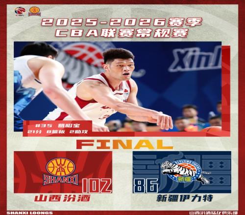 北京时间2026年4月4日20:00,2025-2026赛季常规赛第34轮继续进行,山西汾酒客场挑战新疆伊力特。两队历史上共交手42次,山西汾酒10胜32负。上赛季两队交手2次,山西汾酒1胜1负。本场比赛,山西队阶段性防守做得不错,特别是开局阶段,防守专注度较高,篮板球拼抢积极。进攻端多点开花,较早建立大比分领先,但在第三节有所松懈,赛后还需总结调整,最终全场比赛结束,山西汾酒102:86战胜新疆伊力特。