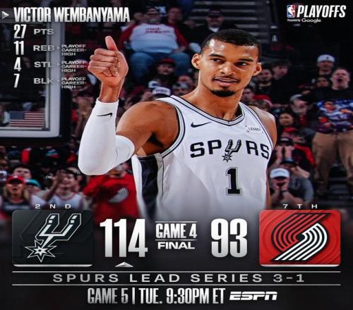 北京时间4月27日,NBA季后赛继续火热进行。开拓者坐镇主场与马刺展开首轮G4的对决,大比分2比1领先的圣安东尼奥渴望在此战夺下赛点。文班亚马伤愈复出,并且携手尚帕尼、瓦塞尔、卡斯尔与福克斯出任首发。亨德森、霍勒迪、阿夫迪亚携手卡马拉、克林根担任波特兰首发,杨瀚森继续担任替补。两大超人气球队,在此役上演了激烈厮杀。该场比赛的走势,出现了多次转折,可谓是精彩纷呈。在文班亚马、福克斯、卡斯尔等人的联手爆发之下,马刺最终逆转取胜,得以夺下赛点。