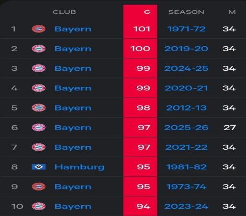 6.拜仁慕尼黑 97球 2025-26赛季 27轮比赛(本赛季德甲还剩7轮)
