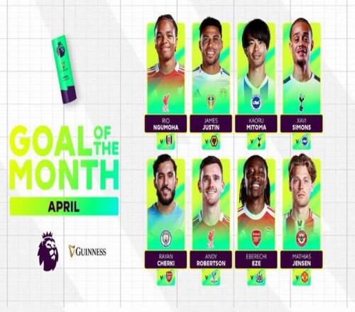 北京时间4月30日,英超官方公布了联赛4月最佳进球的8个候选者。利物浦恩古莫哈、罗伯逊入围,谢尔基对阵阿森纳的进球以及埃泽的远射世界波也获得提名。
