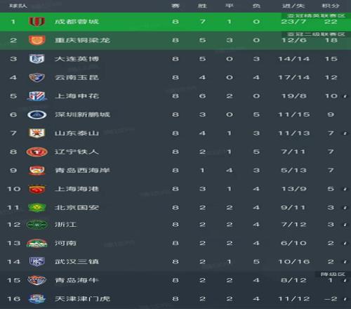 中超最新积分榜